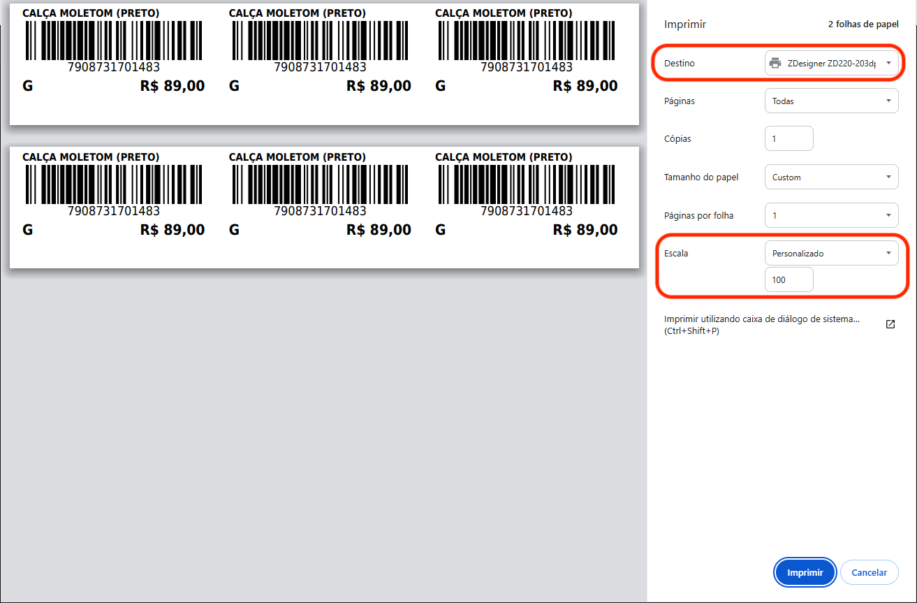 Ao imprimir as etiquetas é necessário selecionar corretamente a impressora, neste caso a Zebra e também definir a Escala como "Personalizada" em 100, conforme a imagem abaixo.